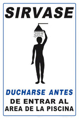 This Please Shower Before Entering Pool With Graphic aluminum sign measures 12 x 18 inches, is printed on heavy-duty aluminum material and is designed to prevent patrons from entering the pool area without showering first. It is a safety code requirement to shower prior to entering a public pool or spa. Our general information signs are very noticeable and used to inform people of facility restrictions, policy, object location or instruction. This sign is lightweight, durable, and waterproof for indoor or outdoor use.This swimming pool and facility pool sign is designed for harsh swimming pool and outdoor environments. It is predrilled in each corner for easy hanging or mounting. This sign is printed using our high-quality weather and sun resistant inks.
