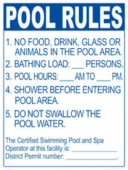 Management may have their own rules to post for their aquatic facility. Some of these policy rules may even be required by your state. This Please Shower Before Entering sign is a needed for sanitary reasons. This sign is a requirement for the District of Columbia but can be included in the pool rules.