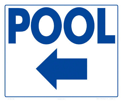 This Pool Arrow Left aluminum sign measures 12 x 10 inches, is printed on heavy-duty aluminum material and is designed to point patrons in the direction of the pool. Our general information signs are very noticeable and used to inform people of facility restrictions, policy, object location or instruction. This sign is lightweight, durable, and waterproof for indoor or outdoor use.All of our swimming pool, residential and facility signs are of the highest quality and predrilled for easy hanging. This sign is printed using our high-quality weather and sun resistant inks.