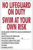 According to your state code, a No Lifeguard sign is required to be posted when there is no lifeguard required. The main lettering height on this sign is 4 inches as required by Rhode Island code with an age limit of 18 years. Rhode Island requires Swim at Your Own Risk on the sign as well as other required text.