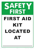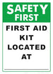 Safety First Aid Kit Located at Sign - 10 x 14 Inches on Styrene Plastic (Customize or Leave Blank)