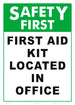 First Aid signs are used to designate the location of your First Aid equipment. This sign shows that the First Aid Kit is located in the office.