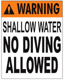 This Warning Shallow Water No Diving Allowed Sign measures 24 x 30 inches, is printed on .040 mil Styrene Plastic, and is designed to prevent patrons from diving in shallow water. This sign contains 6 inch and 4 inch lettering as required by some states. Our Warning signs indicate a potentially hazardous situation which, if not avoided, could result in death or serious injury. This sign is lightweight, durable and weatherproof for indoor or outdoor use.This swimming pool and facility pool sign is designed for harsh swimming pool and outdoor environments. It includes a brass grommet in each corner for easy hanging or mounting. This sign is printed using our high-quality weather and sun resistant inks.