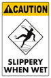 This Caution Slippery When Wet With Graphic aluminum sign measures 12 x 18 inches, is printed on heavy-duty aluminum material, and is designed for safety reasons to be posted at an area that is slippery when wet. Our Caution signs indicate a potentially hazardous situation which, if not avoided, could result in moderate or minor injury. This sign is lightweight, durable and weatherproof for indoor or outdoor use.