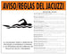 Notice Spa Warnings and Regulations Sign in Spanish with Graphic. Lettering height on sign meets specific standards and guidelines. This sign is guaranteed to meet the state laws of Alabama, Alaska, Arizona, Idaho, Louisiana, Maine, Michigan, Minnesota, Mississippi, Montana, North Dakota, Oklahoma, Pennsylvania, Tennessee, Texas and West Virginia.Our compliance signs are thoroughly researched twice yearly and updated as needed. We guarantee our rules and regulations signs to meet specific state swimming pool codes within ninety days of purchase or they will be replaced, free of charge.