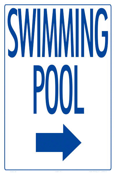 This Swimming Pool Arrow Right Sign measures 12 x 18 inches, is printed on .040 mil Styrene Plastic and is designed to point patrons in the direction of the pool. Our general information signs are very noticeable and used to inform people of facility restrictions, policy, object location or instruction. This sign is lightweight, durable, and waterproof for indoor or outdoor use.This swimming pool and facility pool sign is designed for harsh swimming pool and outdoor environments. It includes a brass grommet in each corner for easy hanging or mounting. This sign is printed using our high-quality weather and sun resistant inks.