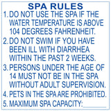 Spa rules signs list the most important rules for swimmers as defined by state, local or federal guidelines. These rules specify proper use of the Spa including hygiene, hours of operation, diving rules among others. Most states require posting of Spa rules signs at all commercial Spas. These signs are essential to limiting liability for Spa owners and lifeguards.