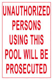 This Unauthorized Persons Using This Pool Will Be Prosecuted aluminum sign measures 12 x 18 inches, is printed on heavy-duty aluminum material and is designed to prevent unauthorized patrons from entering the facility. Our general information signs are very noticeable and used to inform people of facility restrictions, policy, object location or instruction. This sign is lightweight, durable, and waterproof for indoor or outdoor use.This swimming pool and facility pool sign is designed for harsh swimming pool and outdoor environments. It is predrilled in each corner for easy hanging or mounting. This sign is printed using our high-quality weather and sun resistant inks.